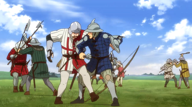 Choosing France during the Hundred Years War as a setting makes for some very interesting history. Combine this with the presence of many pantheons including Norse and Celtic deities and you get a world glittering with nuggets of lore. However, in many ways these serve no purpose. Using the obscure Celtic god Cernunnos as a jealous and power-hungry deity seems like a cowardly way of injecting a totally-not-Lucifer character. The valkyries watching English and French battles have no historical reason to be present and ultimately only serve to show that, hey, they exist. Reappropriating religious mythos just because they’re neat is hardly something new to Japanese animation (Shinji, get in the fucking robot!) but it would be refreshing to see it done with some reasoning behind it.